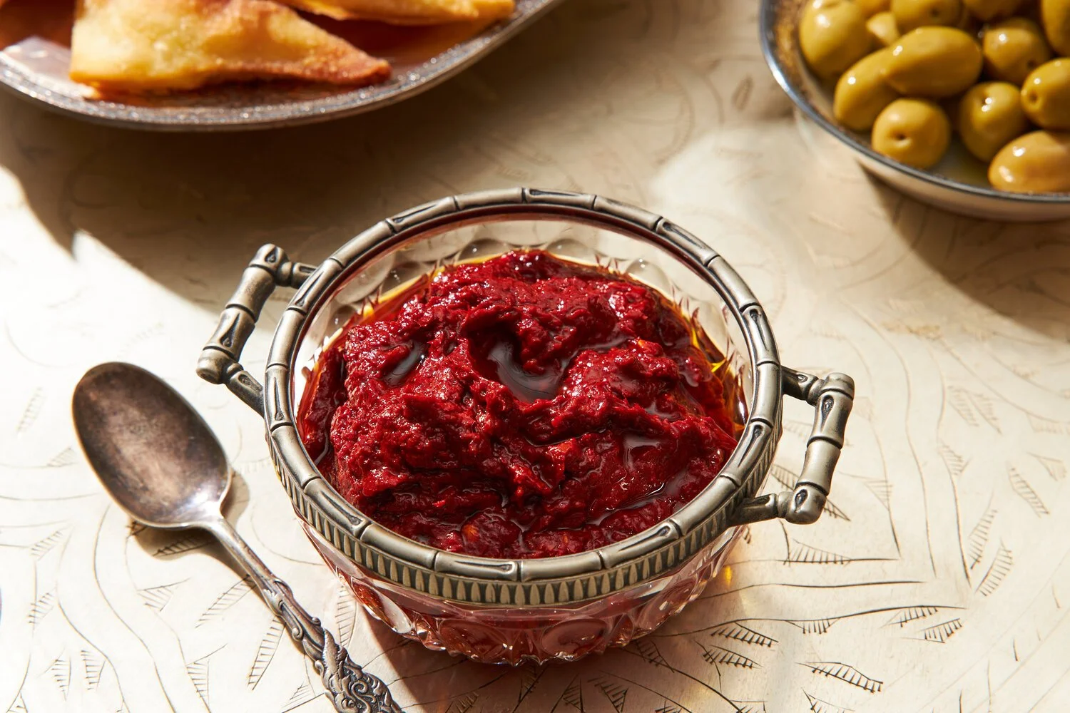“My mom was the queen of aperitif,” says Joanna Bensimon, owner of The Hamsa Brand, a harissa company. “Every single Friday, no matter what,” their coffee table in Queens, New York was covered with glasses of cognac, whiskey, red wine, and Campari and elegant linen napkins. To snack, there were fava beans tossed in salt and cumin, crisp and golden beef cigars with harissa, potato-filled triangles called pastels, cocktail nuts, pickles, and harissa.